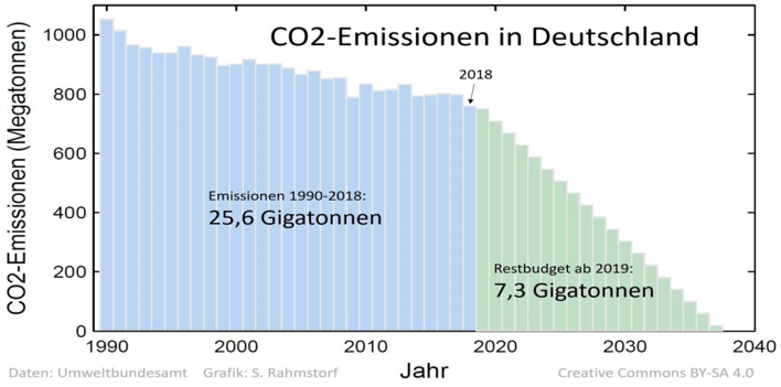 Für Deutschland, aber zunächst erstmal mit einem zurückliegenden Startjahr 2018, würde das CO2-Restbudget bei 7,3 Gigatonnen liegen, welches bis Mitte/ Ende der 30er Jahre auf Null heruntergefahren werde müßte:
