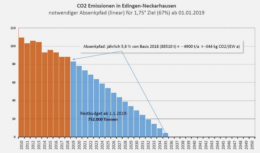 Wenn man vom weltweiten CO2-Restbudget ausgeht (z.B. Angaben vom Umweltbundesamt) und dieses mit den Bevölkerungsanteilen für Deutschland bzw. Edingen-Neckarhausen gewichtet, landet man bei einem CO2-Restbugdet für Edingen-Neckarhausen von 752 Megatonnen. Startjahr für den Absenkpfad ist hierbei der 01.01.2019. Das veranschlagte Gradziel ist 1,75°C. Bei einem linearen Absenkpfad sind somit 4.900 Tonnen pro Jahr an CO2-Reduktionen notwendig.